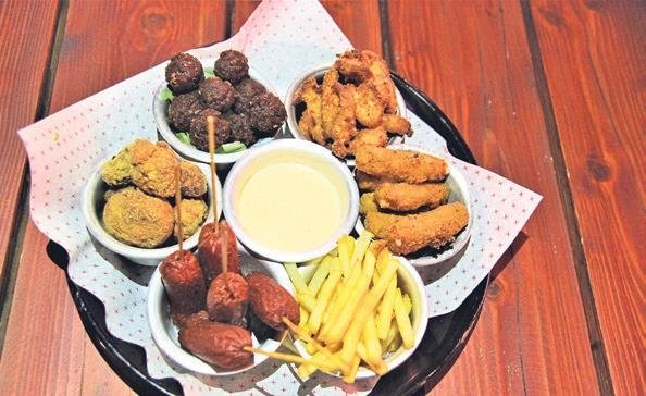 SUPER STARTER; Ortaya karışık misket köfte, pane tavuk mozeralla steak, pane mantar, çubuk patates ve sosis şiş dinamik sos ile servis edilmekte